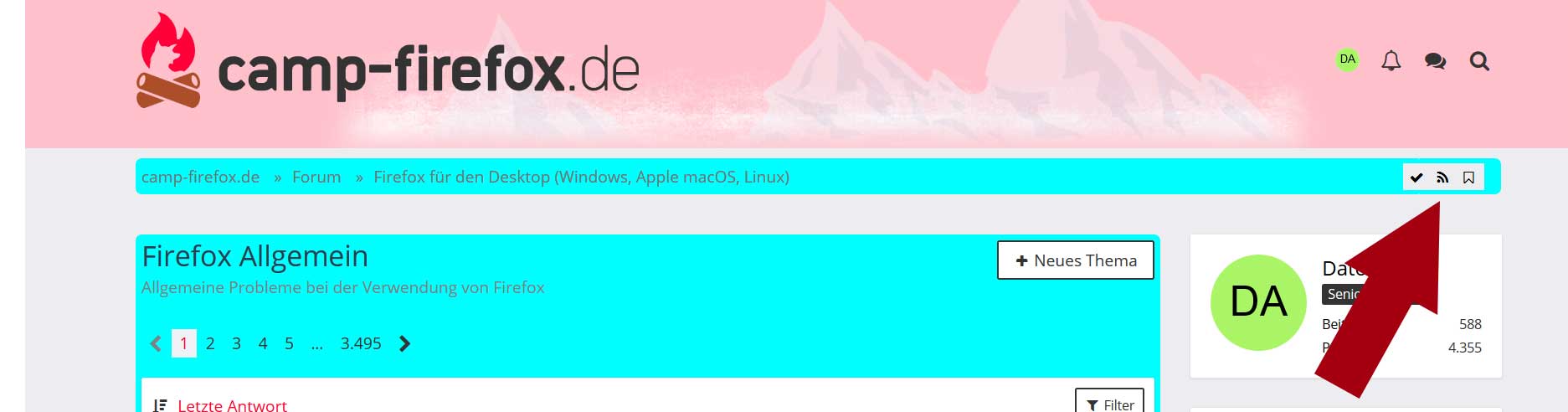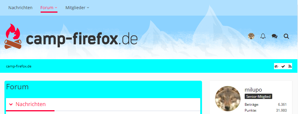 Alles anzeigen@-moz-document domain("camp-firefox.de") { .breadcrumbs > ol , .content{ background-color:aqua !important; padding:6px !important; border-radius:6px !important; } /*Hintergrund in Aqua über ganze Leistenbreite*/ .pageNavigation { background-color: aqua !important; } /*Weißer Hintergrund hinter den Symbolen*/ ul.pageNavigationIcons.jsPageNavigationIcons { background: white !important; } }Das entspricht diesem Screenshot: