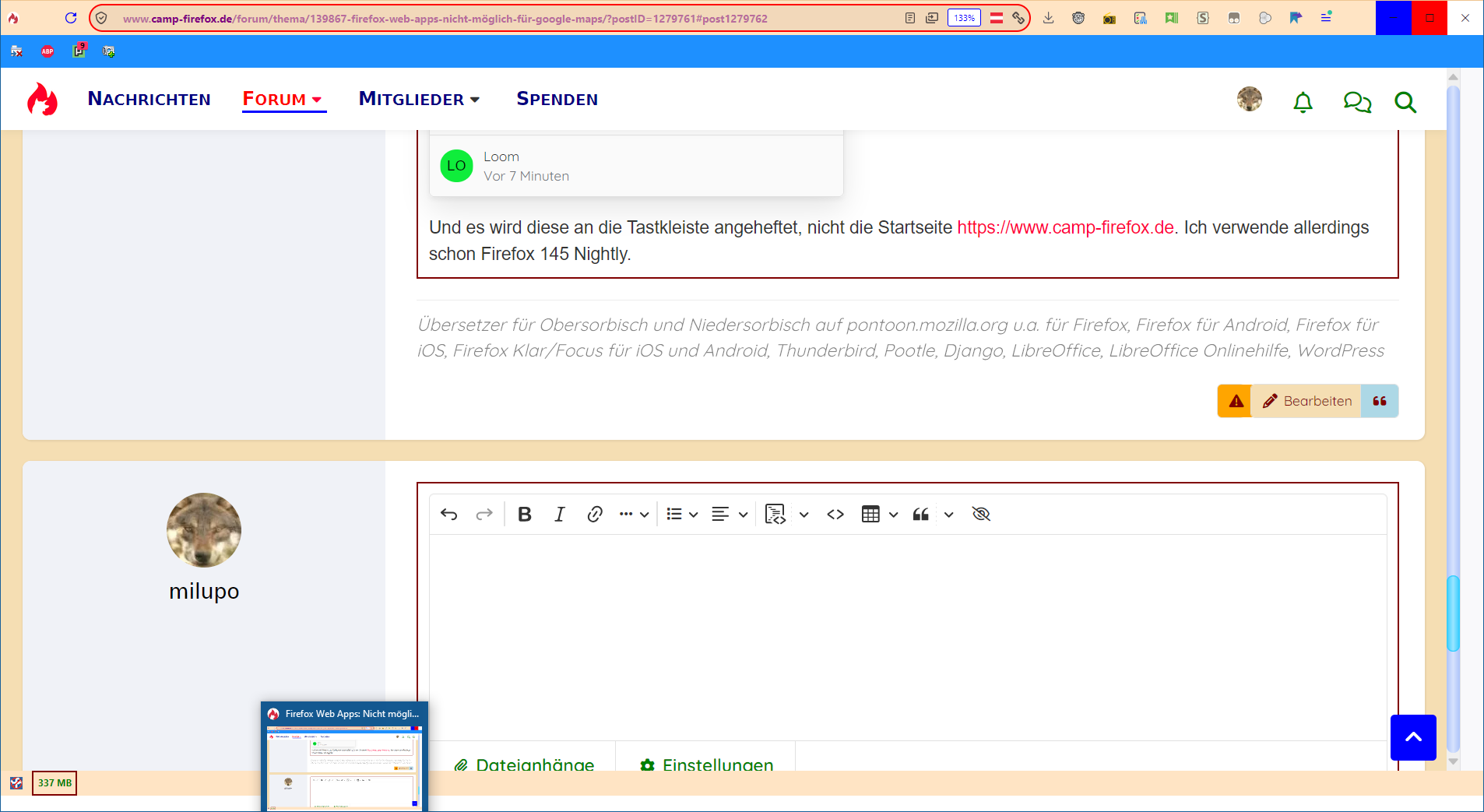 Die dazu passenden Verknüpfungen sind auch im Start-Menü unter "Firefox Web-Apps" zu finden.Loom22. September 2025 um 16:09 Und es wird diese an die Tastkleiste angeheftet, nicht die Startseite https://www.camp-firefox.de. Ich verwende allerdings schon Firefox 145 Nightly.