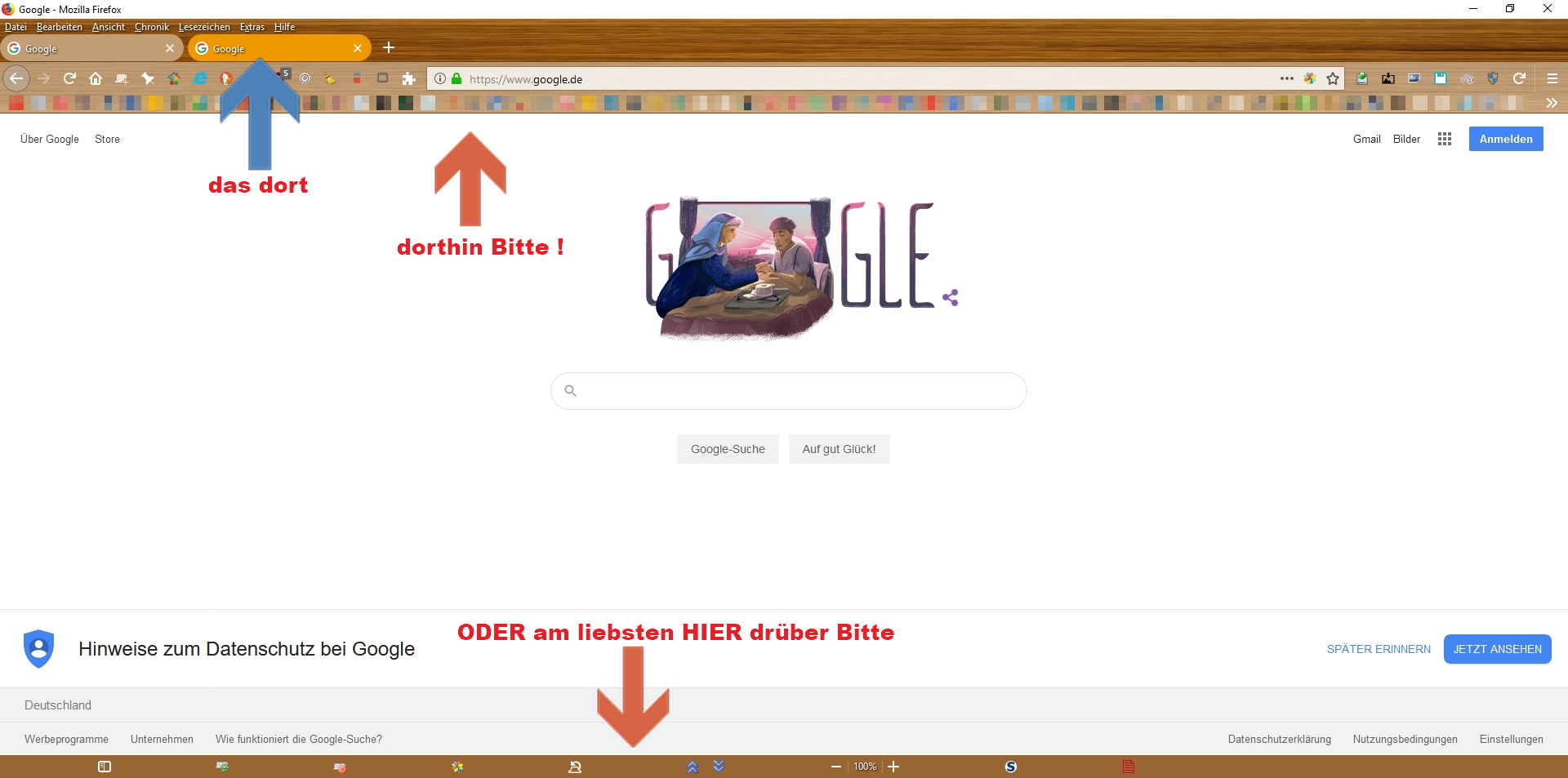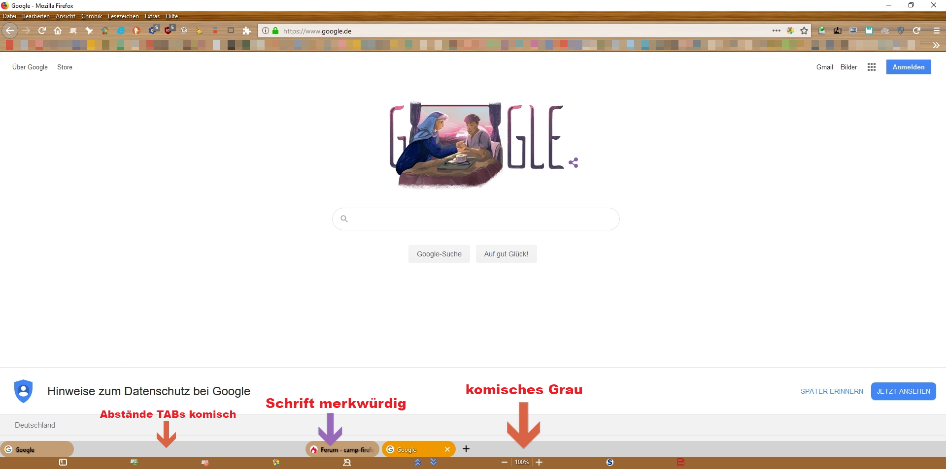 CSS Alles anzeigen#content-deck { margin-bottom: 28px !important; } #TabsToolbar { margin-bottom: 28px !important; /* Abstand nach unten*/ background: lightgrey !important;/* Hintergrundfarbe*/ position: fixed !important; bottom: 0 !important; width: 100% !important; } #tabbrowser-tabs > tab:not([pinned]) { width: 200px !important; /*Tabbreite*/ } #alltabs-button { display: none; } /*Damit die Tableiste nicht 2 zeilig wird wegen dem Button:New Tab*/ .tabbrowser-arrowscrollbox > .arrowscrollbox-scrollbox { width: 1400px !important; }Die Farbe und die Abstände musst du dir dann selber noch anpassen.