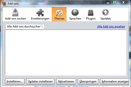 ich habe nach dem Windows Patch-Day gestern einen Neustart durchgeführt und danach festgestellt, dass das Übersichtsfenster unter Extas/Add-ons anders als vorher angezeigt wird (siehe Anhang), die installierten Addons, Themes und Plugins nicht mehr sichtbar sind und es nicht mehr möglich ist, die installierten Addons ect. zu aktualisieren. Das ist ja sehr seltsam. Wurde seitens FF daran etwas geändert?