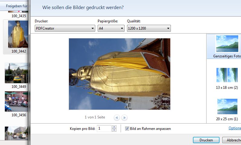 mit bildern aus dem internet direkt aus dem browser klappt es bei mir auch. jetzt versucht aber mal, ein auf der festplatte gespeichertes bild mit rechtsklick zu drucken und dann eine pdf datei daraus zu generieren. im hochformat. klappt bei mir mit pdfcreator nicht!