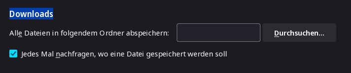 Auch hier war das Feld für den Download-Ordner leer. Downloads landeten dennoch im Nutzerprofil "Downloads". So für Ubuntu, Debian, Mint. Scheint irgendwie gewollt zu sein.