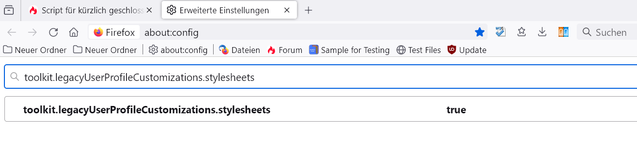 Ich habe den Eintrag toolkit.legacyUserProfileCustomizations.stylesheets mit about:config auf true umgestellt. Nach einem Neustart: keine Änderung. Irgendwas mache ich noch falsch.