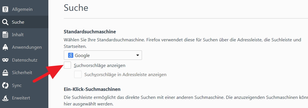 Ich habe einmal probehalber Häkchen gesetzt und dann wieder entfernt. In beiden Fällen werden weiter die Suchvorschläge angezeigt.