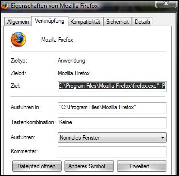 also bislang war die Verknüpfung mit diesen Angaben angelegt ; "C:\Programme\Mozilla Firefox\firefox.exe" -P