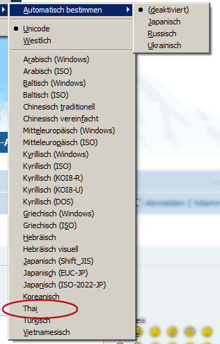 D.h. "Thai" ist bei mir unter Menü: Ansicht -> Zeichenkodierung vorhanden, jedoch nicht unter Menü: Ansicht -> Zeichenkodierung ->Automatisch bestimmen.