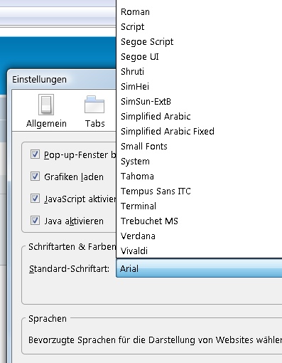 Ich habe ein neues Notebook mit Vista Home Premium und Firefox 3.0.11. Zum Surfen habe ich mir ein Benutzerkonto mit eingeschränkten Rechten eingerichtet. Da in diesem Konto die Webseiten nicht genauso wie im Administratorkonto angezeigt werden, wollte ich das über Extras/Einstellungen/Inhalt/Schriftarten korrigieren. Times New Roman wird aber in der Liste gar nicht angezeigt. Wieso ist das so? Was kann ich tun? Danke für Eure nette Hilfe!