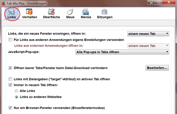 Ja, ich habe bei TabMixPlus den Einzelfenstermodus gewählt. Deshalb versteh ich das FF-Verhalten auch nicht.Bevor ich meine Einstellungen aufschreibe, hier einige Screenshots; der erste aus den FF-Einstellungen, die drei folgenden aus TabMixPlus: