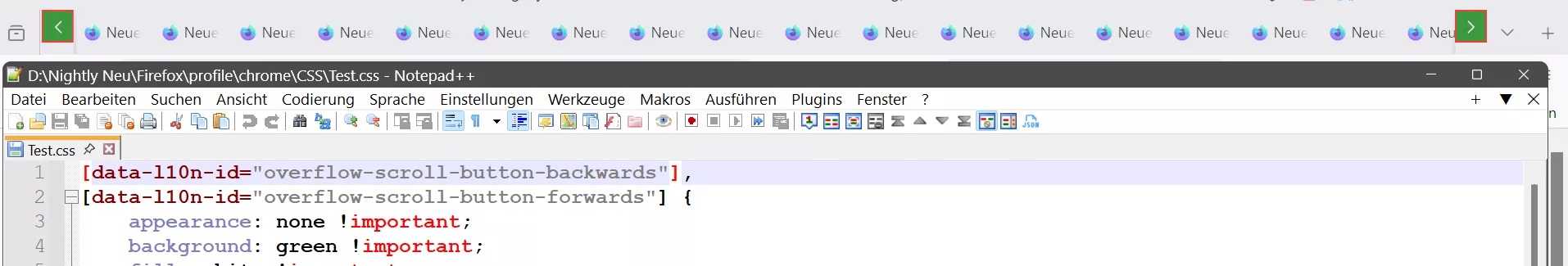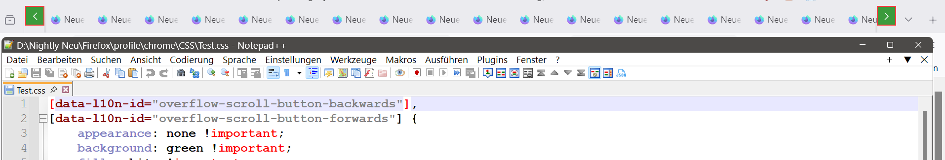 Alles anzeigen#tabbrowser-arrowscrollbox, #pinned-tabs-container { &::part(scrollbutton-up), &::part(scrollbutton-down) { fill: red !important; background: lightgrey !important; border: 1px solid grey !important; border-radius: 5px !important; height: 32px !important; } } #tabbrowser-arrowscrollbox, #pinned-tabs-container { &::part(scrollbutton-up):hover, &::part(scrollbutton-down):hover { fill: blue !important; background-color: yellow !important; --arrowscrollbox-scrollicon-hover-background-color: transparent !important; border: 1px solid red !important; } } -