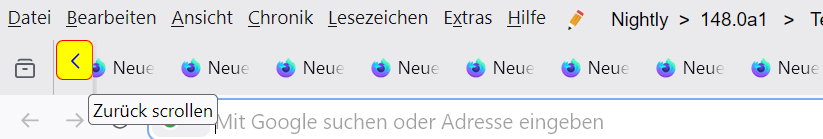 Alles anzeigen#tabbrowser-arrowscrollbox, #pinned-tabs-container { &::part(scrollbutton-up), &::part(scrollbutton-down) { --arrowscrollbox-scrollicon-active-background-color: transparent !important; fill: red !important; background: lightgrey !important; border: 1px solid grey !important; border-radius: 5px !important; height: 32px !important; } } #tabbrowser-arrowscrollbox, #pinned-tabs-container { &::part(scrollbutton-up):hover, &::part(scrollbutton-down):hover { fill: blue !important; background-color: yellow !important; --arrowscrollbox-scrollicon-hover-background-color: transparent !important; border: 1px solid red !important; } }Dann sieht es hier so aus:
