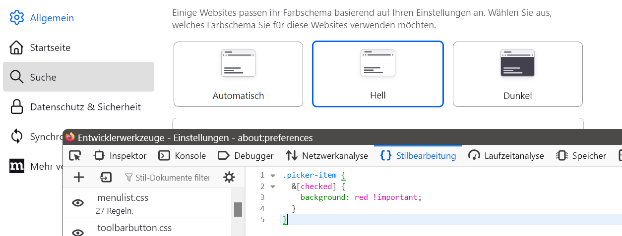 Mit den Entwickler-Werkzeugen möchte ich den Hintergrund einfärben. Dann trage ich den Code unter: Stilbearbeitung ein und erhalte: