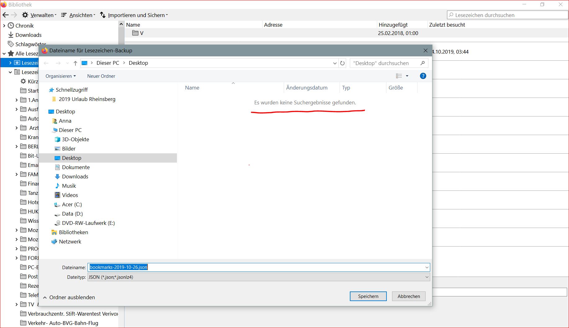 Dann habe ich nun mal die Lesezeichen auf dem Laptop gesichert, und wenn ich da auf die Sicherungsdatei bookmarks mit Doppelklick draufgehe, wird mir gezeigt "die folgende Datei kann nicht geöffnet werden"