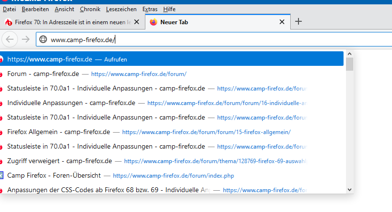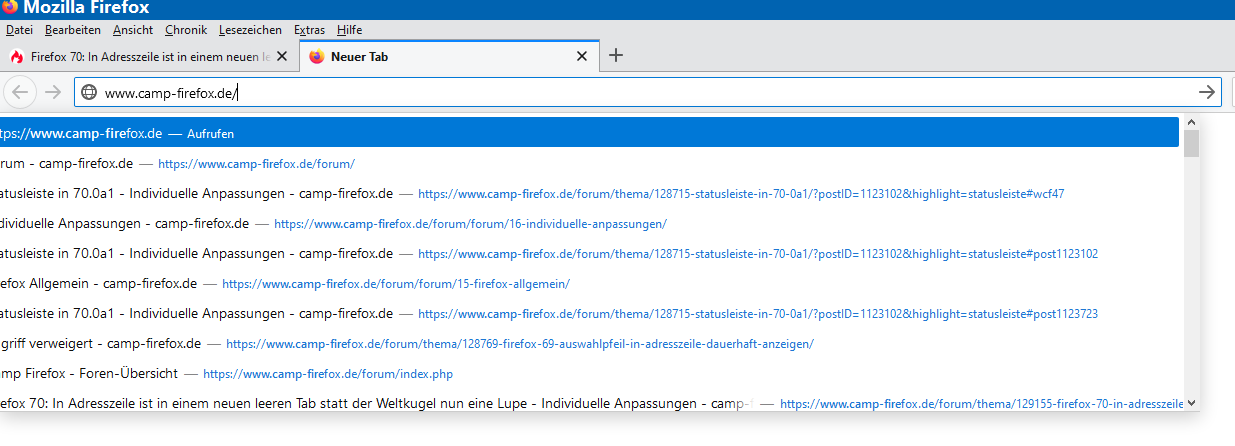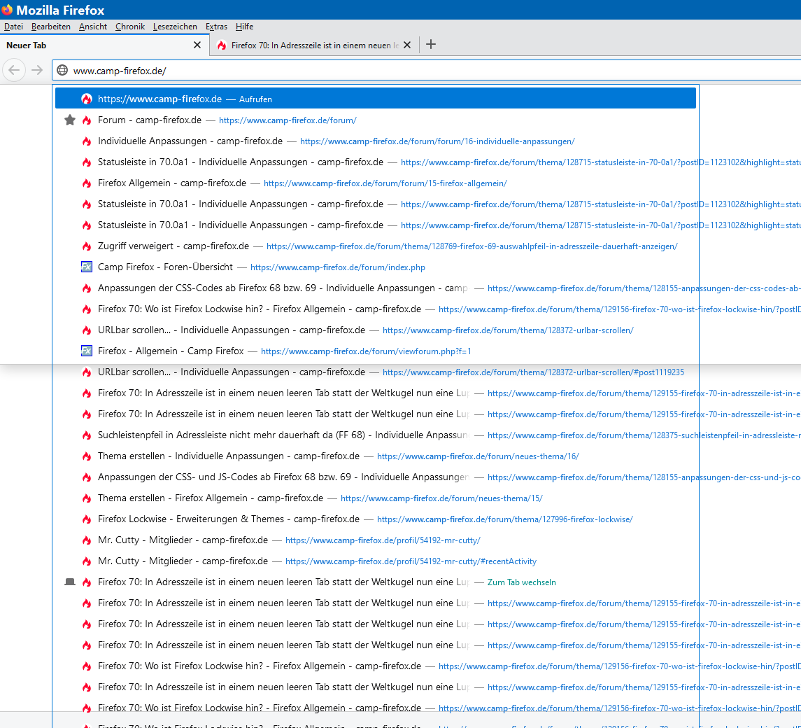 Alles anzeigen/* -------------------------------------------------- */ /* Angepasste Seitenauflistung unter der Adressleiste */ /* -------------------------------------------------- */ :root { /* Wert muss identisch in about:config = browser.urlbar.maxRichResults sein */ --ac_popup_number_of_results: 80; /* Je höher der Wert oben, je kleiner muss der px Wert sein */ --ac_popup_maxheight: calc(3px * ( var(--ac_popup_number_of_results) + 1 )); --ac_popup_height:calc(400px * var(--ac_popup_number_of_results)); } /* Maximale Einträge die ohne zu scrollen angezeigt werden */ #urlbarView-results { height: var(--ac_popup_height) !important; max-height: var(--ac_popup_maxheight) !important; } /* Scrollbar wird bei Bedarf angezeigt */ #urlbarView-results { overflow-x: hidden !important; } /* Popupfenster schmaler, oder diesen Teil vom Code entfernen bzw. auskommentieren */ .urlbarView-body-outer, #urlbarView-results { max-width: 1000px !important; max-height: 400px !important; margin-left:0px !important; padding-left: 0px !important; padding-right: 0px !important; } /* Popup nach links verschoben */ #urlbar-results { margin-top: -1px !important; margin-left: 74px !important; border-top: 1px solid #0078D7 !important; border-bottom: 1px solid #0078D7 !important; border-left: 1px solid #0078D7 !important; border-right: 1px solid #0078D7 !important; } /* Breite der Url */ .urlbarView-url { overflow: visible !important; } /* Ges. Textfeld nach links an den Rand */ .urlbarView-row-inner { margin-left: -40px! important; } /* 'Suchen ...' unter Seitenauflistung entfernen */ label[anonid="searchbar-oneoffheader-search"][value="Suchen mit:"], .search-panel-current-input{ display: none !important;} .search-panel-one-offs{ display: none !important;}Und sieht nun mit FF 70 so aus.