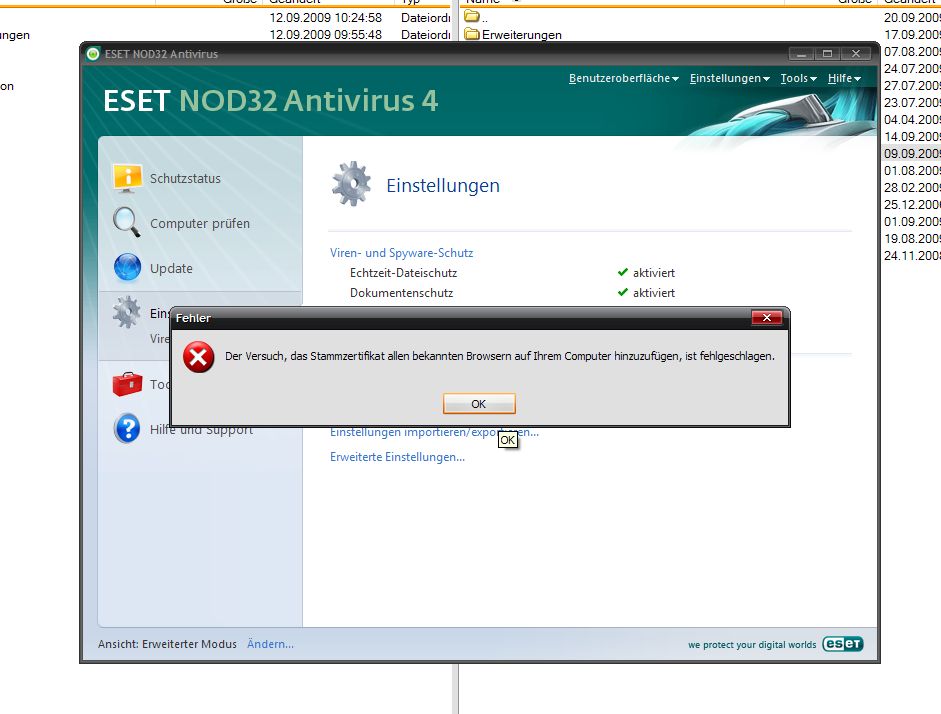 hab hier das o.g. problem, das ich, wenn ich bei NOD32 V4, die SSL Prüfung aktiviere, eine meldung kommt mit "Der Versuch, das Zertifikat ... hinzuzufügen, schlug fehl".