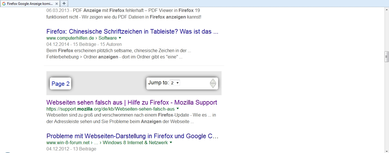 seit gerade eben wird Google jetzt auf Firefox komisch dargestellt, auf Internet Explorer ist noch alles wie gewohnt, am Ende der Seite mit den Suchergebnissen kann man auf die Folgeseiten klicken. Bei Firefox laden die sich jetzt selbst, habe mal einen Screenshot gemacht, weil ich nicht weiß, wie ich das in Worte fassen soll. Habe ich unbemerkt irgendwas gedrückt oder geklickt und wenn ja was und wie kann ich das wieder rückgängig machen oder ist das eine neue unbequeme Idee von Google? -