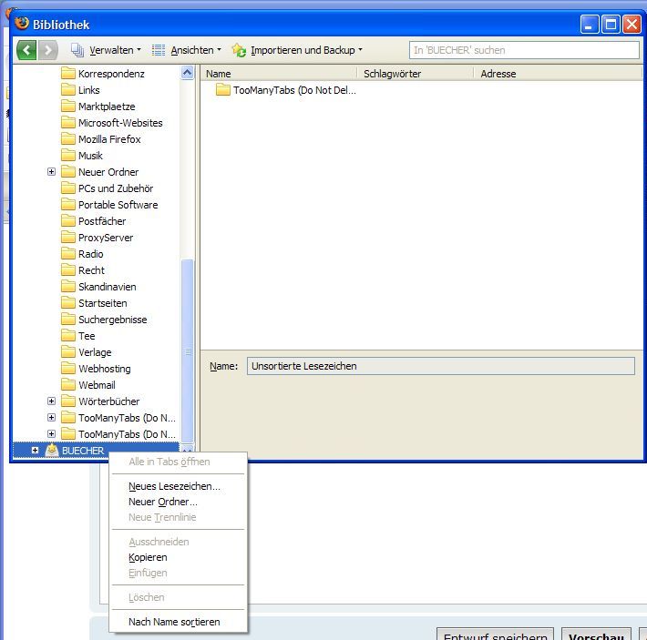 Ich schicke am besten 'mal einen Screenshot. Unten die unterlegte Zeile "Bücher" hieß vor meinem Unfall "Unsortierte Lesezeichen", und leider gibt es die Option "umbenennen" nicht. Ich weiß übrigens nicht, wieso der Ordner im "Baum" links "Bücher" heißt und im Inhaltsfeld daneben immer noch "Unsortierte Lesezeichen" (in der untersten Zeile, diese Zeile ist aber inaktiv, man kann nichts reinschreiben). Das ist auch so ein Rätsel. Aber vielleicht kann sich ja jemand einen Reim drauf machen.