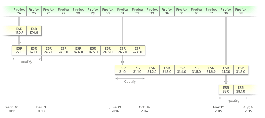 [attachment=0]Firefox_ESR_Zyklus.png[/attachment] Quelle: Enterprise/Firefox/ExtendedSupport:Proposal.