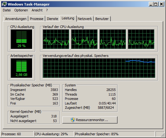 Ich habe eine 4 GB große Auslagerungsdatei. Ich habe nur das Gefühl, daß diese nie benutzt wird, denn wenn mir die Minianwendung eine RAM-Auslastung von 95% zeigt, dann fängt das System unweigerlich an zu keuchen, auch wenn die CPU-Last nur zwischen 5-25% beträgt.Ach, was waren das für Zeiten, als man mit Rechenschieber und Logarithmentafel, ein paar Großrechenanlagen und viel Gottvertrauen zum Mond flog?