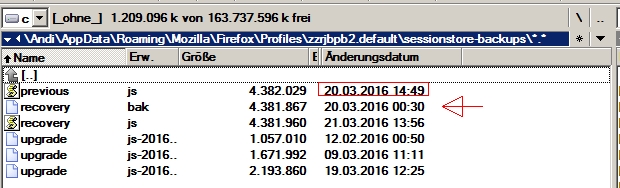vielen Dank für die Antwort. Mit der in #2 genannten Methode hat es leider nicht geklappt. Ich hänge mal ein Bild an, wie es in dem entsprechenden Ordner /sessionstore-backup aussah. Die Datei mit dem roten Pfeij ist wohl klar. Die habe ich dann entsprecehnd umbenannt und einen Ordner höher geschoben. eider ohne Erfolg. Das geht ja mit Total Commander ales recht einfach. Die rot umrandete Datei entspricht einem Zeitpunkt, wo noch alles in Ordnung war.