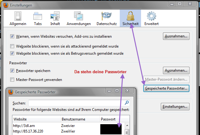 Extras > Einstellungen > Sicherheit > Gespeicherte Passwörter > Passwörter anzeigen