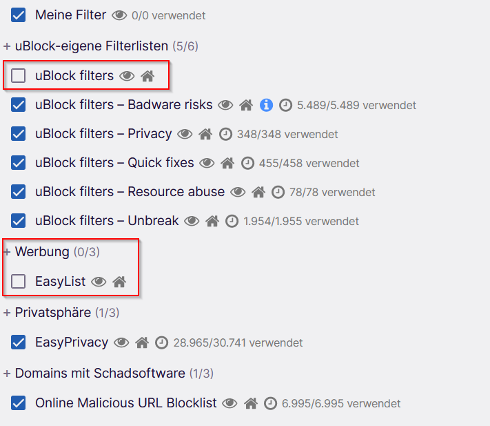 Es ist denkbar dass wegen der beiden deaktivierten Filter jetzt auf anderen Seiten (mehr) Werbung angezeigt wird.