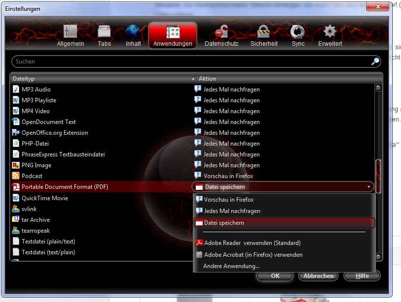 Dieser Eintrag steht immer auf "Datei speichern", den ändere ich dann in "Adobe Acrobat in Firefox öffnen.