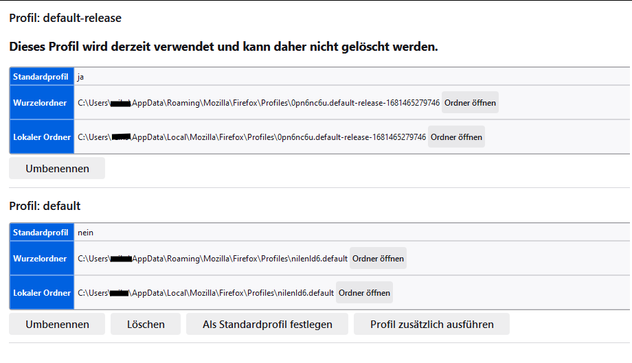 In das bestehende Profil komme ich über %AppData% oder über die Hilfefunktion vom FF.