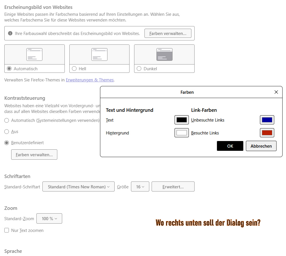 Dass ich keine Häkchen setzen kann, wäre zu verschmerzen. Denn: Wenn ich z.B. Häkchen bei mehreren E-Mails setze, um sie in den Papierkorb zu befördern, dann sind keine Häkchen zu sehen, sie wandern aber in den Papierkorb. Was mich wirklich stört, ist, dass ich beim Verfassen von E-Mails in Web.de Schrift- und Hintergrundfarbe nicht mehr wählen kann. Alles andere, wie Schriftart, Schriftgröße usw. schon. Mir bleibt momentan also nur der Kompromiss: Ich stelle die Schriftfarben im Firefox auf Automatisch und kann meinen E-Mails die gewünschten Farben verpassen, oder ich stelle sie auf Benutzerdefiniert und den Unterschied zwischen aufgerufenen und nicht aufgerufenen Google Seiten farblich so, wie ich es haben möchte. ☮️?
