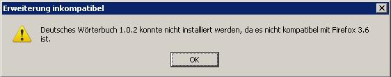 Wenn ich die Erweierung Deutsches Wörterbuch 1.0.2 (https://addons.mozilla.org/de/firefox/addon/3077?src=api) installieren will kommt folgende Meldung:[attachment=0]ff3.6unddw1.0.2.JPG[/attachment]