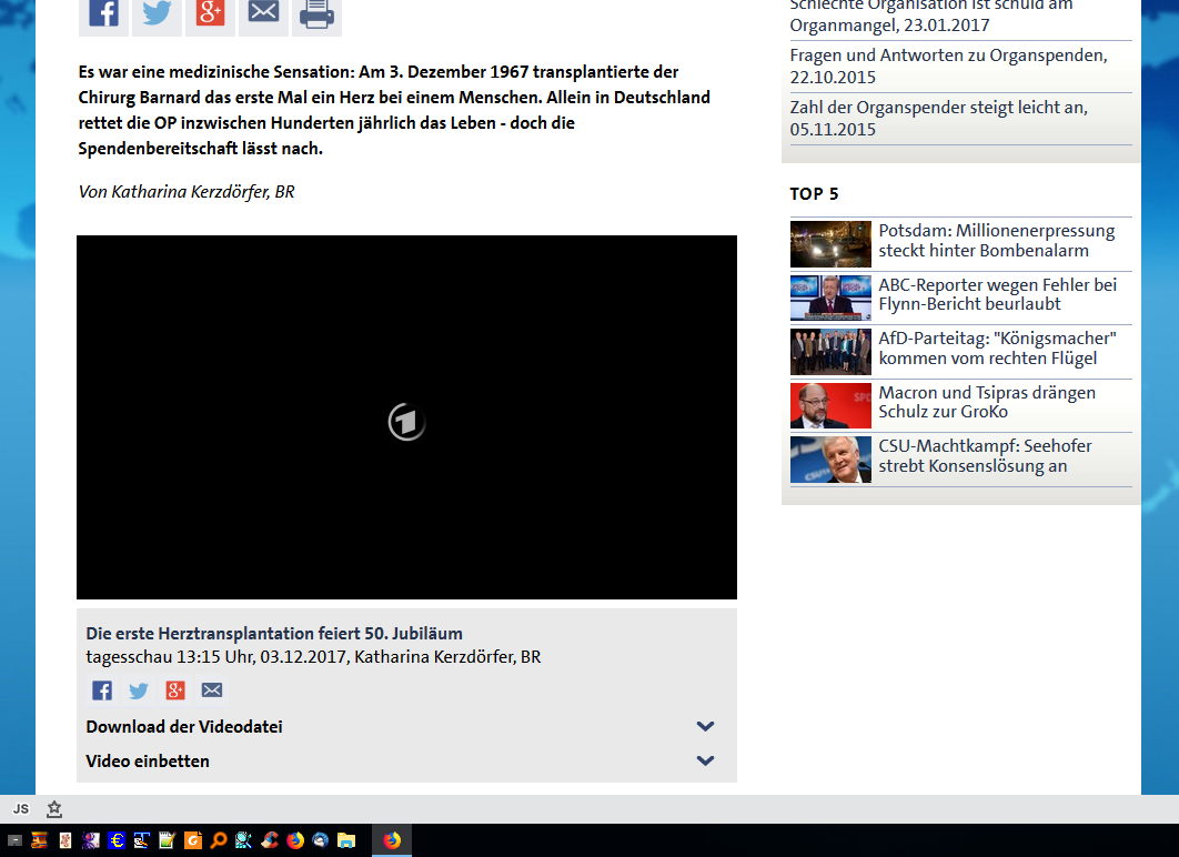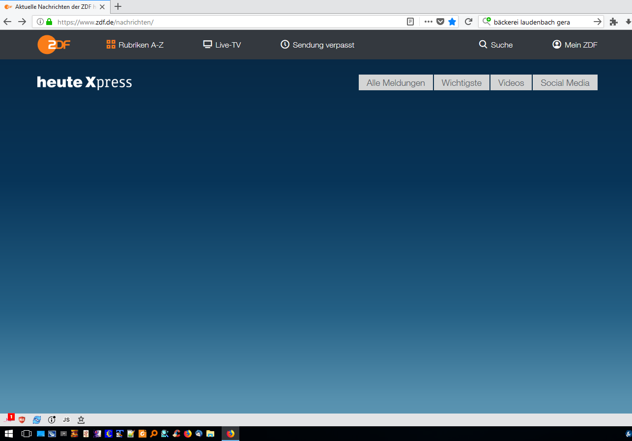 leider hat das geschriebene bei tagesschau.de doch nichts gebracht; der Fehler ist wieder gekommen. Der Tipp in Beitrag # 9 des Threads https://www.camp-firefox.de/forum/viewtopic.php?f=1&t=123484 hat endlich geholfen. Auf allen Seiten die Videos enthalten wird es nun angezeigt.Das umstellen hat jedoch keinen Einfluss auf http://zdf.de/nachrichten. Hier habe ich trotzdem immer wieder das abgebildete Ergebnis. Wenn ich die Seite hoch und runter scrolle sind alle Artikel zu sehen. Nur der Teil heuteXpress ist leer. Ich habe das Verhalten übrigens auf meinem Notebook und auf dem Desktop PC. Auch in einem neuen Firefox mit neuem Profil. Kann das ganze auch an Windows liegen?