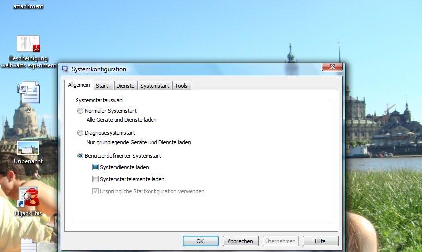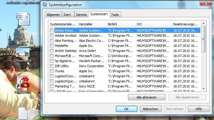 also, ich bin dem Link in der Signatur gefolgt. habe gerade den neustart durchgeführt. firefox funktioniert noch immer nicht und wenn ich mir jetzt die systemkonfiguration anschaue sind noch Häkchen bei Avira Antivir Planer und Guard und bei der Google Toolbar (und natürlich bei den MS-Diensten).