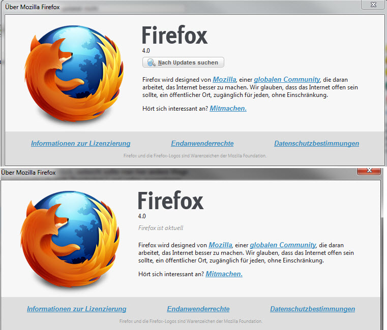 Wenn ich bei "Hilfe>Über Firefox>" auf den Button "Nach Updates Suchen gehe" erhalte ich die Mitteilung, dass der FF aktuell sei.