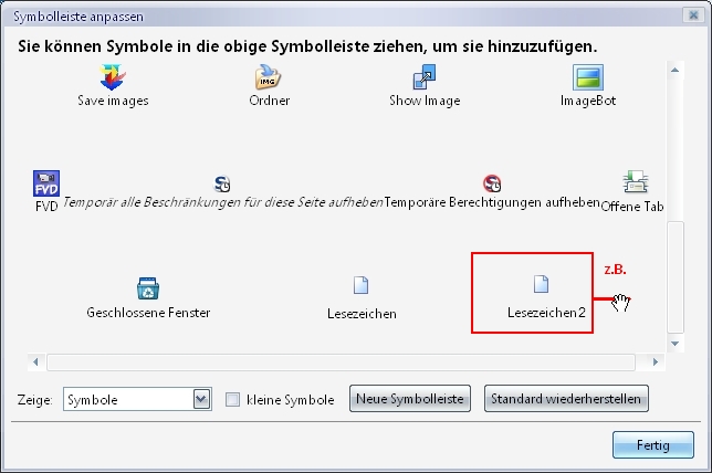 Wenn man auf "Anpassen..." geht so sieht man im Browser einen Bereich mit der Bezeichung "Lesezeichen-Symbole"
