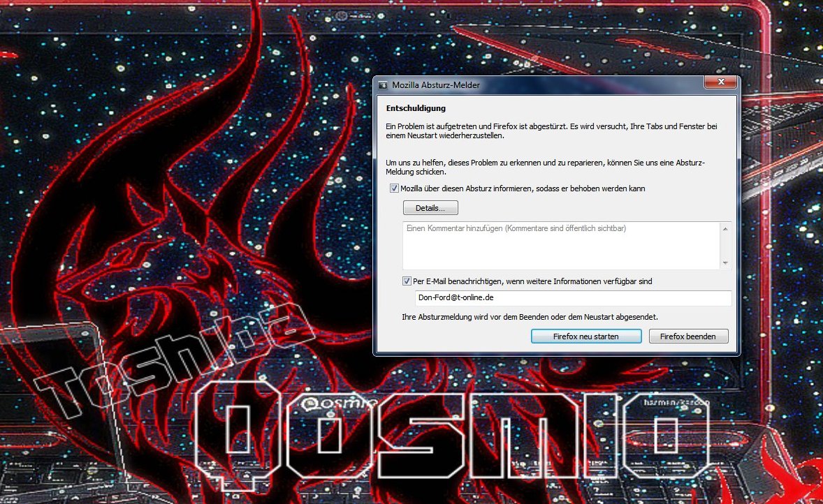 Ja ich sende die meldung an mozilla und ja es ist Toshiba Fingerprint Utility installiert aber was hat das program mit mozilla zu tun und was soll ich im abgesicherten modus bestätigen und wie kann ich den abgesicheten modus starten