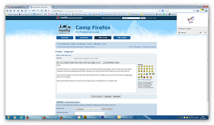 Ich habe Firefox 29.0.1 und heute festgestellt, dass da ein kleines Einhorn herumfliegt, wenn ich rechts oben auf diese 3 schwarzen Streifen (Einstellungs-Menü) klicke. Bei Maus-Over wird das Einhorn bunt (sieht aus wie ein Punk-Einhorn).