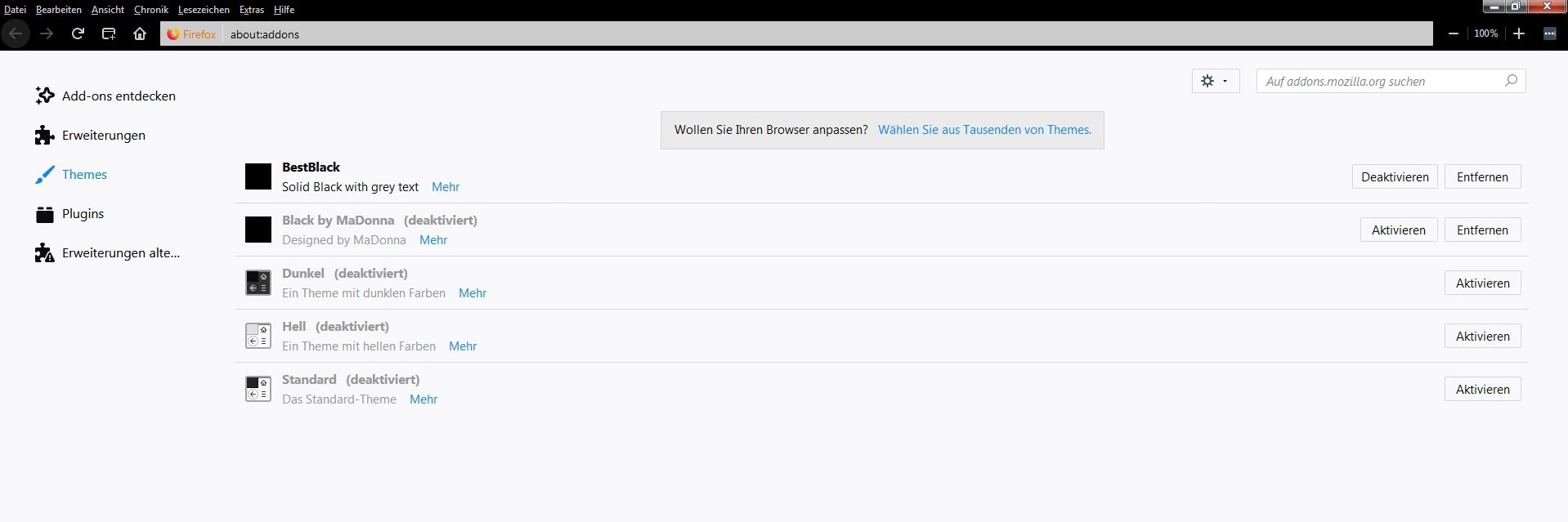 Folgende Add-Ons-Themes sind installiert: