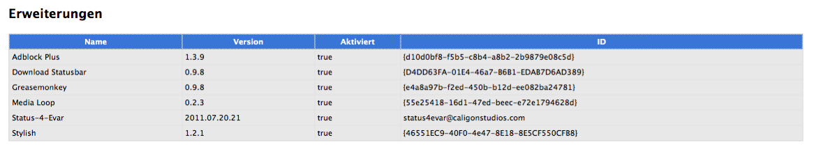 Ok hier ist das, wodrum du mich gebeten hast. Ich hoffe es hilft (die Auflistung der Erweiterungen findest du als Bilddatei):