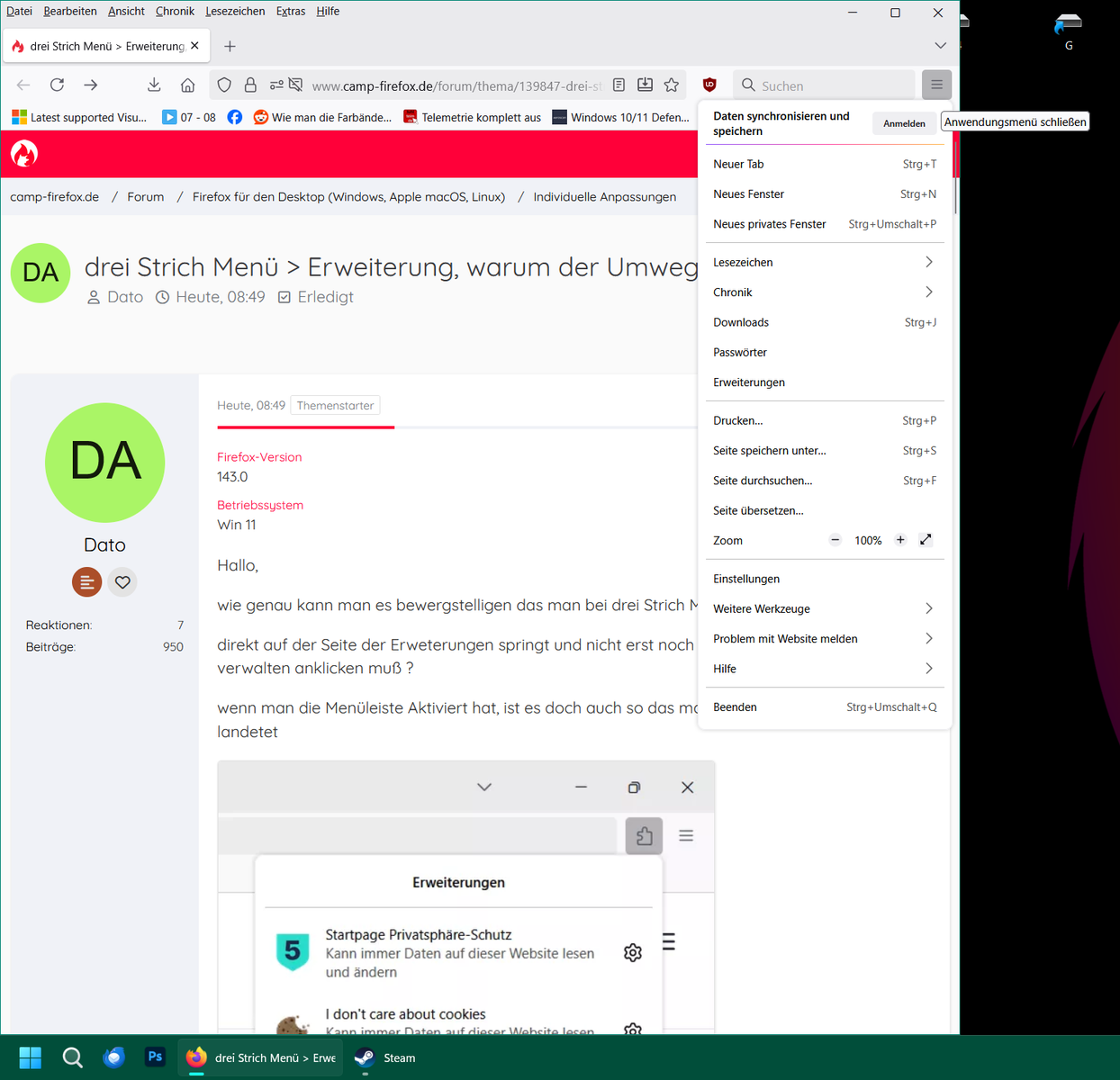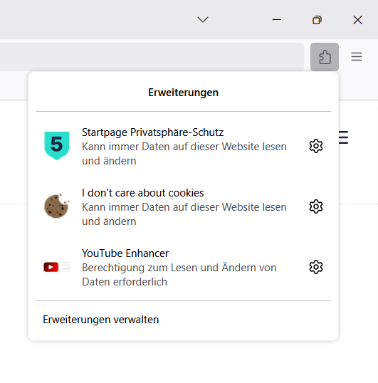 Ebenfalls unklar ist, was du mit „drei Strich Menü > Erweiterungen“ meinst.