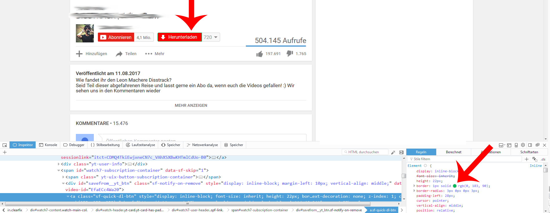 CSS@-moz-document domain("www.youtube.com") { .sf-quick-dl-btn{ background: #ff0000 !important; font-size: 12px !important; /* font-weight: bold; */ }da bleibt noch ein kleiner grüner Rand