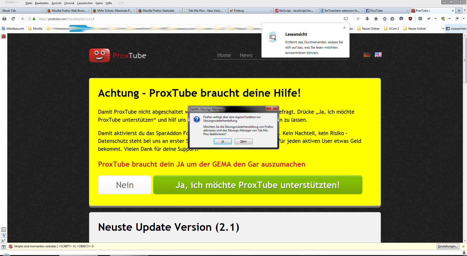 jetzt habe ich YouTube Unblocker Plus installiert und mal sehen wenn ein Update für dne Fux kommt, ob es jetzt funktioniert.