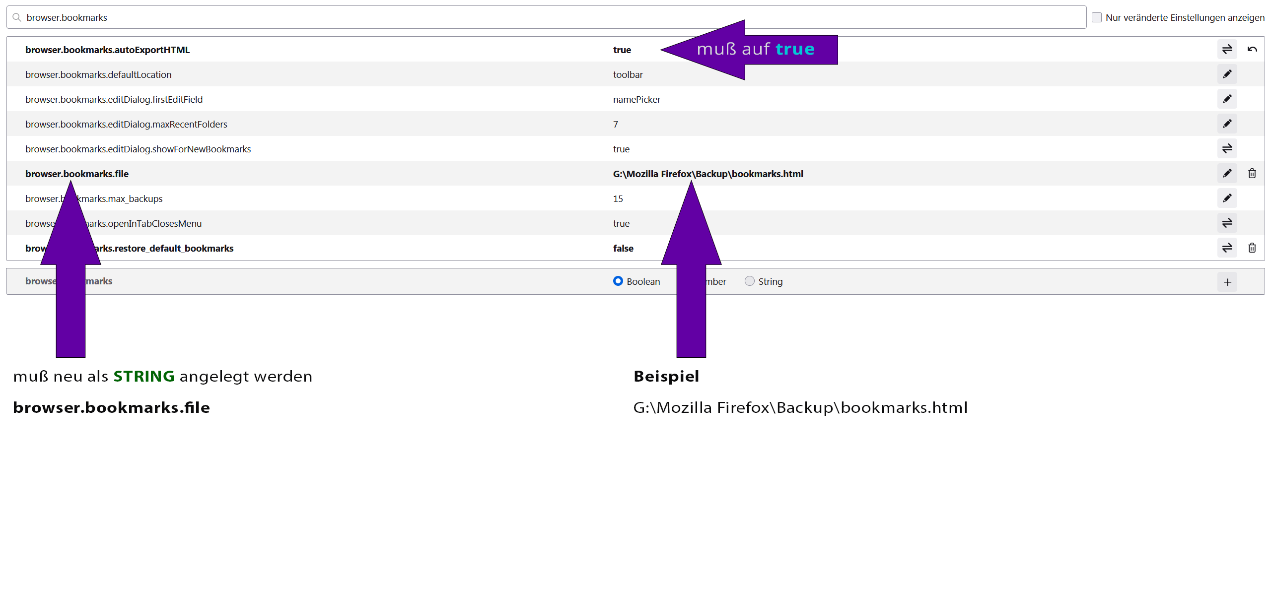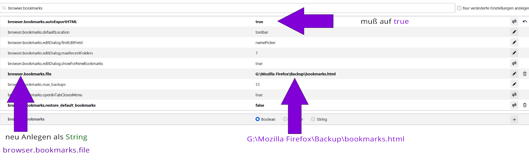 03. es muß ein neuer STRING angelegt werden > browser.bookmarks.file <