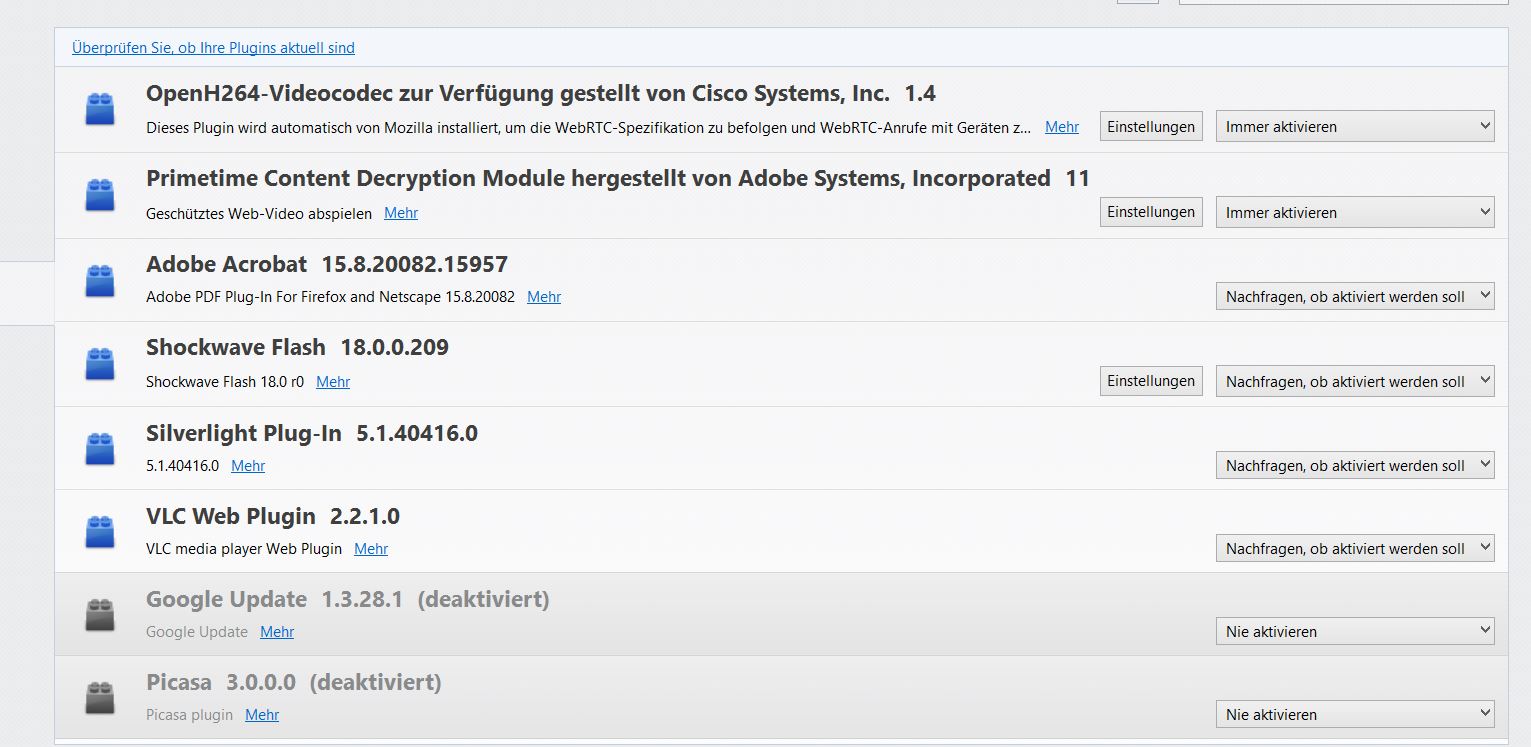 nachdem ich meinen Adobe Flashplayer erfolgreich aktualisiert habe, ist mir aufgefallen, dass ich eine ganze Reihe Plugins oder Addons (oder beides :oops: ) im FF habe, die ich im Waterfox nicht habe und der, möglicherweise deshalb, schneller ist.