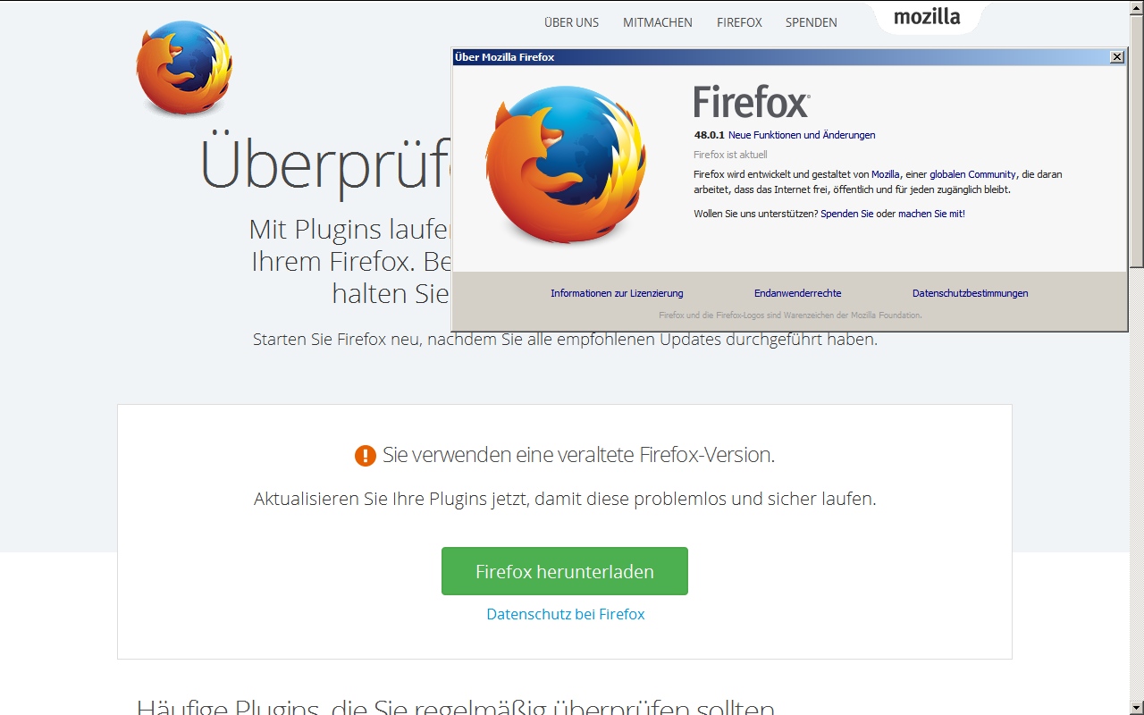 eben wollte ich prüfen, ob meine Plugins noch aktuell sind (über http://www.mozilla.org/de/plugincheck). Das Ergebnis: "Sie verwenden eine veraltete Firefox-Version". Ein Klick auf Hilfe/Über Firefox zeigt jedoch das Gegenteil: 48.0.1 "Firefox ist aktuell" (siehe Screenshot). Welche Aussage stimmt denn nun?