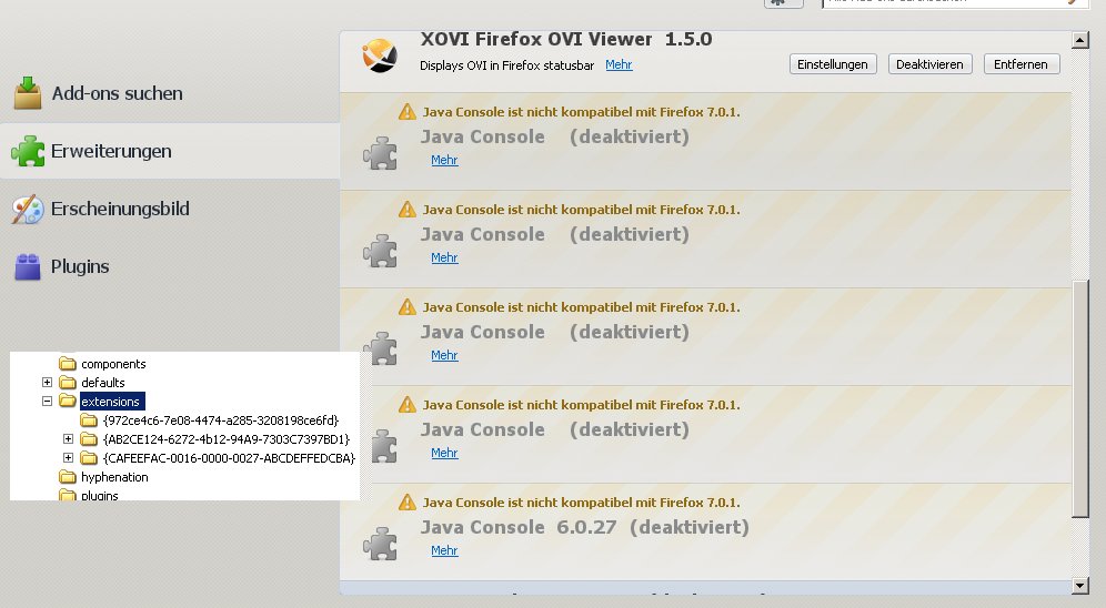 in meiner Add-on-Liste sind mehrere alte Versionen der Java Console grau hinterlegt, da mit aktueller FF-Version nicht mehr kompatibel. Leider lassen sich die deaktivierten Versionen nicht löschen. Habe versucht den Eintrag über die über die Extensions zu löschen - doch leider habe ich nur die Versionnummern gelöscht, nicht jedoch den eigentlichen Eintrag... :-??