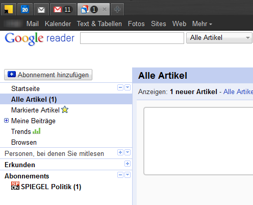 Kleiner Nachteil: Bei E-Mails sind die E-Mails direkt sichtbar, beim Google Reader ist es etwas anders: Links in der Liste der Feeds sehe ich auf der Seite dann auch die neuen Artikel angezeigt, rechts erscheinen die neuen Artikel aber nicht automatisch, sondern es muss links nochmal auf "Alle Artikel" oder den gewünschten Feed geklickt werden. Oder F5, dann lädt die Seite aber komplett neu, dauert länger.