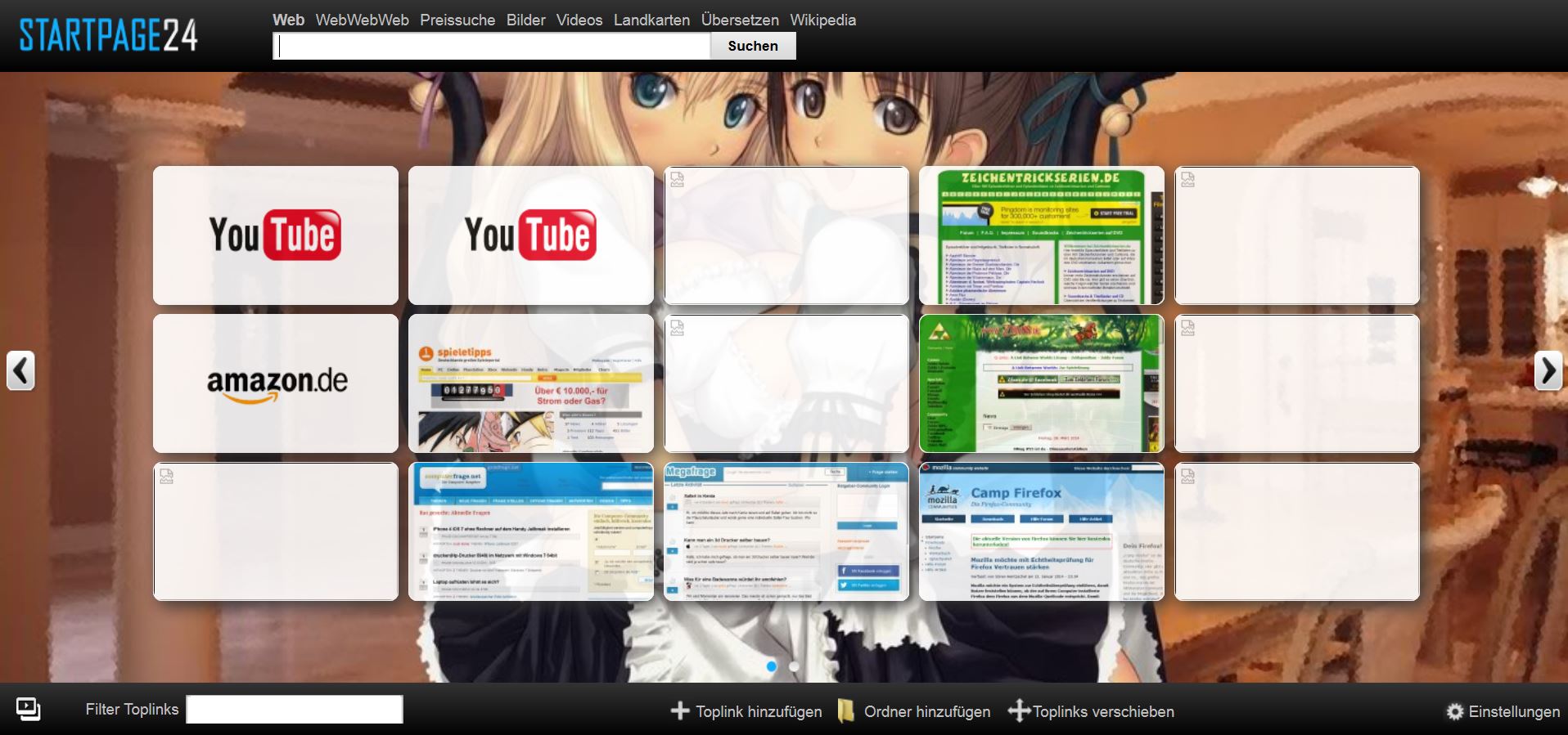 Ich vermisse Add-ons wie Startpage 24 siehe Bild ich hätte gerne wieder eine Startseite wo ich mit Toplinks zugriff auf die Internetseiten habe wo ich öfter besuchen möchte. Würde ich alle Seite wo ich öfters bin als Lesezeichen speicher wäre dies total unübersichtlich für mich.