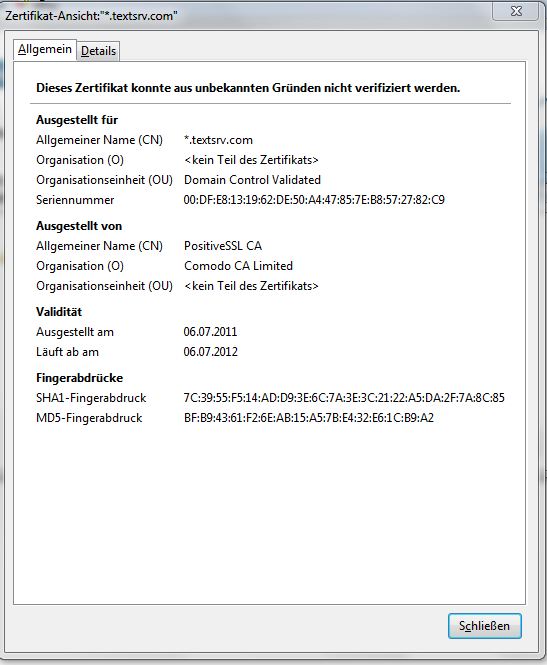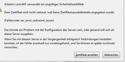 d.text.srv.com:443 verwendet ein ungültiges Sicherheitszertifikat.. (s. Anhang)