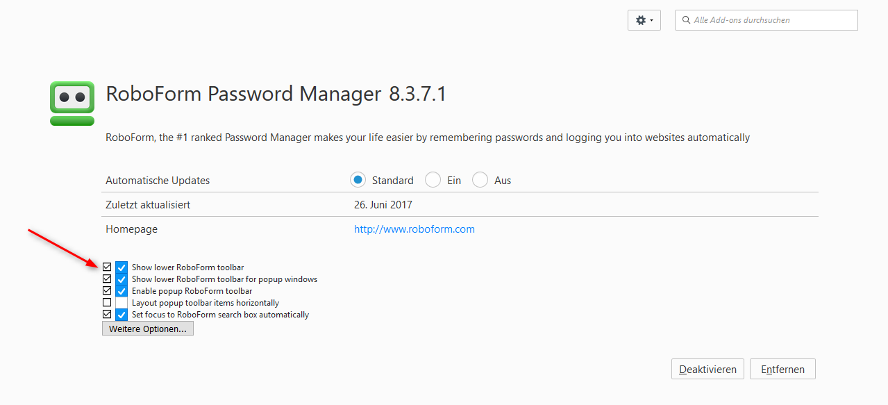 Vor einigen Tagen habe ich Roboform auf die Version 8.2.8.8 umgestellt. Seit dieser Umstellung wird die Roboform Toolbar nicht mehr angezeigt. In den Erweiterungen wird das Add-on als Version 7.9.23 angezeigt. In den Einstellungen der Roboform Toolbar funktioniert die Schaltfläche "Settings" nicht!