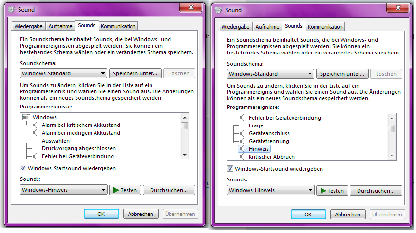Was meinst du mit programmereignisse? Unter Systemsteuerung >> Sounds steht Hinweis unter dem Reiter Windows, aber mehr wird mir da nicht angezeigt.