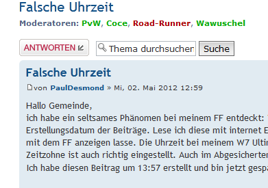 ich habe ein seltsames Phänomen bei meinem FF entdeckt: Wenn ich im Forum lese, sehe ich die Uhrzeit und das Erstellungsdatum der Beiträge. Lese ich diese mit internet Explorer, ist alles eine Stunde später verfasst als wenn ich es mit dem FF anzeigen lasse. Die Uhrzeit bei meinem W7 Ultimate unten rechts zeigt die richtige Zeit an und meine Zeitzohne ist auch richtig eingestellt. Auch im Abgesicherten Modus ohne jegliche Adons etc passiert das gleiche.